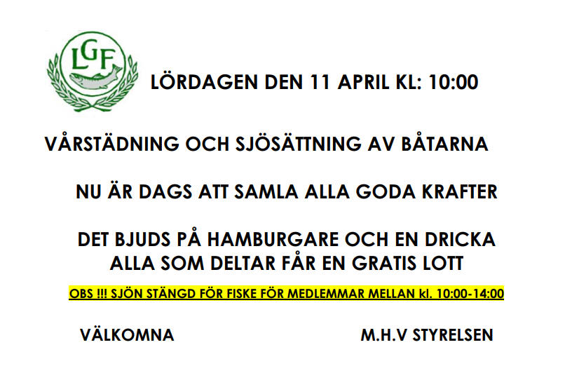 REGLER Fiskekort:Dygnskortet gäller ej 24 timmar utan fram till 00.00 samma dag man köper det, efter 00.00 måste man lösa ett nytt kort. Kortet är personligt och får inte överlåtas. Uppmaning från tillsynsman ska ovillkorligen efterföljas! Även tomtägare runt sjön ska medföra giltigt fiskekort vid fiske.Endast fiske med fluga, haspel/spinn, mete och pimpel är tillåtet. Powerbait och liknande smak/doftbeten får inte användas. Endast ett spö åt gången får användas, med en rev och en krok. Att kasta räkor eller annan fiskföda i vattnet för att locka till sig fisk, s.k. mäskning, är inte tillåten.Flytring får användas, men det är inte tillåtet att släpa ett bete efter ringen.Max 2 laxartade fiskar får fångas på ett fiskekort och dygn. Övriga fiskarter ingen begränsning. Fisk som blöder, lägger sig på sidan eller med buken uppåt måste tas upp och avlivas. Då 2 laxartade fiskar fångats och tagits upp får man inte under några omständigheter fortsätta fiska om man inte löser nytt fiskekort.Minimimått för gädda är 40 cm. Mindre gäddor krokas av försiktigt och släpps tillbaka.Det är inte tillåtet att fiska från LGF´s bryggor eller från andra privata bryggor eller tomter utan tillstånd från tomtägare.